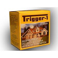 TRIGGER - 1 preparat eksploatacyjny, zawierający enzymy i bakterie rozkładające zanieczyszczenia organiczne w ściekach (odchody, papier, resztki roślinne, tłuszcze) oraz substancje poprawiające degradację środków piorących i myjących.
