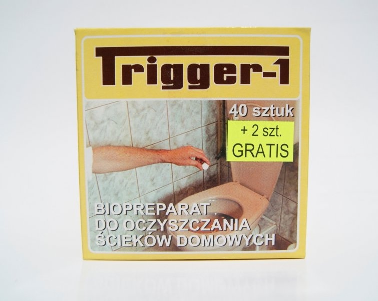 TRIGGER - 1 preparat eksploatacyjny, zawierający enzymy i bakterie rozkładające zanieczyszczenia organiczne w ściekach (odchody, papier, resztki roślinne, tłuszcze) oraz substancje poprawiające degradację środków piorących i myjących.